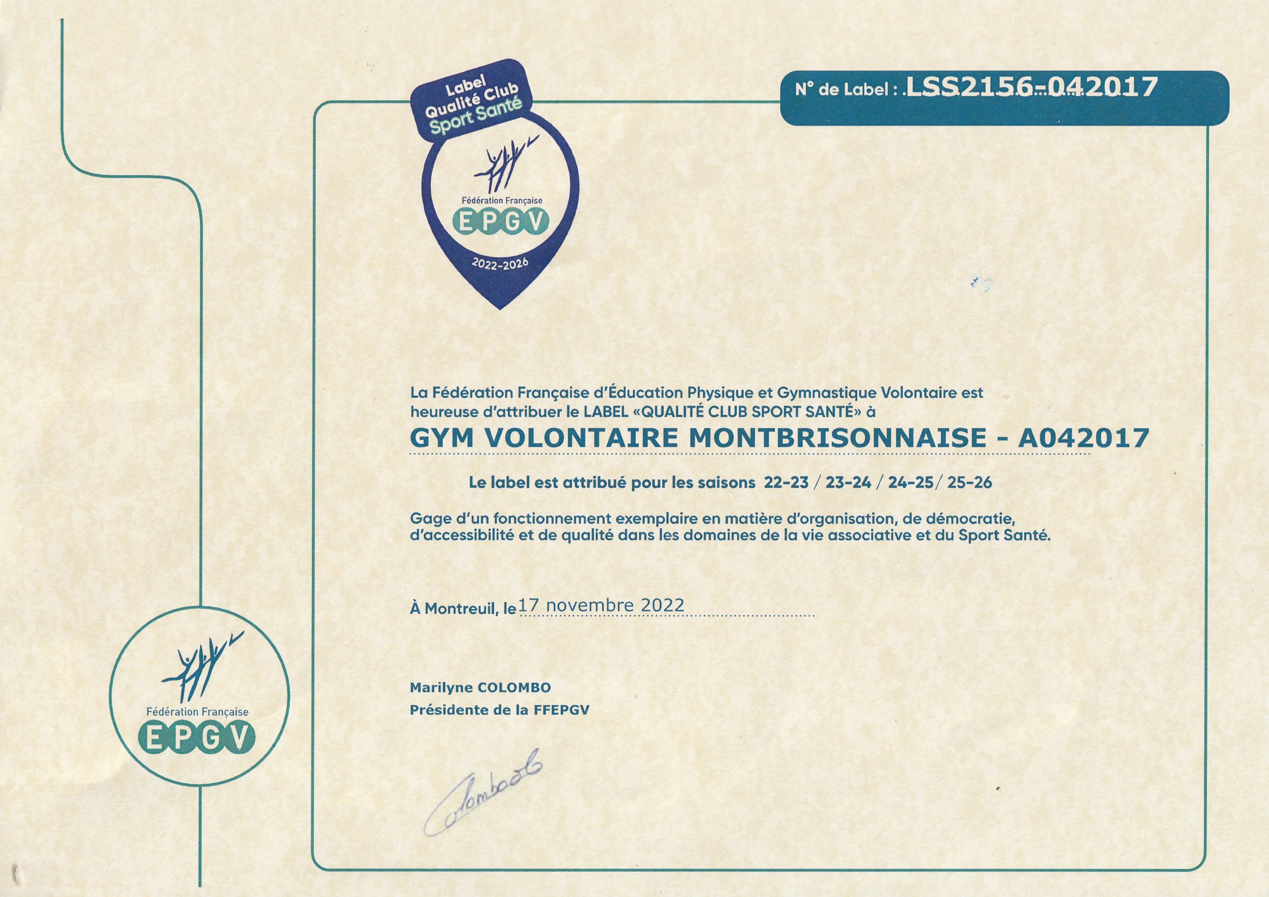 L’association « Gymnastique Volontaire Montbrisonnaise », affiliée à la Fédération Française d’Education Physique et de Gymnastique Volontaire (FFEPGV) bénéficie du Label Qualité « club sport santé », jusqu’en 2026.